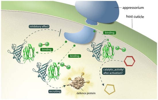 - Weidenbach, D.; Esch, L.; Möller, C.; Hensel, G.; Kumlehn, J.; Höfle, C.; Hückelhoven, R.; Schaffrath, U. Polarized defense against fungal pathogens is mediated by the Jacalin-related lectin domain of modular Poaceae-specific proteins. Mol. Plant 2016, 9, 514–527. [Google Scholar] [CrossRef] [PubMed]