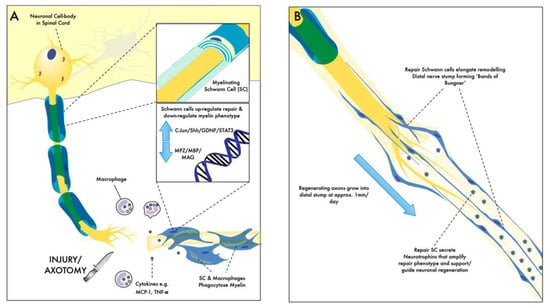 - The initiation of an immune response with the macrophage recruitment and activation of myelin autophagy. There is a marked downregulation of myelin related proteins, including Myelin Protein Zero (MPZ), peripheral myelin protein (PMP22), Early Growth Response 2 (EGR2, also known as krox20), Connexin-32, Myelin Basic Protein (MBP), Myelin-associated glycoprotein (MAG) and periaxin []. There is an upregulated production of monocyte chemotractants, Interleukin-1β (IL-1β), Tumour Necrosis Factor-α (TNF-α) and inducible Nitric Oxide Sythase (i-NOS) [,]. Both activated macrophages and SCs remove and phagocytose the axonal and myelin debris [] Macrophages also play a role in converting SCs to a regenerative phenotype via secreted Interleukin-1 (IL-1), which induces SC nerve growth factor (NGF) secretion. The Macrophage secretion of Transforming Growth Factor-β (TGF-β) and Insulin-like growth factor 1 (IGF-1) encourages mitotic activity in SC, reaching a peak 3–4 days after injury [].