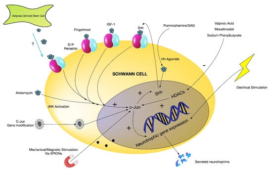 The identification of c-Jun as a key determinant of the denervated SC phenotype creates new routes for potential therapeutic intervention/investigation. The augmentation of c-Jun triggers paracrine and autocrine loops (e.g., Shh activation) that further maintain the rSC phenotype (leading to neurotrophin secretion and morphological changes that aid nerve regeneration). Several pharmaceutical agents (fingolimod/Hh agonists/Anisomycin/HDAC inhibitors) and genetic engineering strategies have been used to directly augment c-Jun and improve experimental nerve regeneration. The use of the ASC secretome, electrical and mechanical stimuli and agonists from the growth hormone axis also modulate the rSC phenotype (likely through the modulation of c-Jun) and have been explored to the same end.