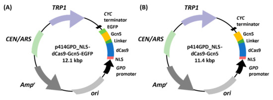 Construction of plasmids for producing fusion protein of dCas9, Gcn5, and EGFP in the nucleus. NLS-dCas9-Gcn5-EGFP or NLS-dCas9-Gcn5 was constitutively produced under the control of the GPD promoter by introducing the centromeric plasmid p414 GPD_NLS-dCas9-Gcn5-EGFP (A) or p414 GPD_NLS-dCas9-Gcn5 (B), respectively. NLS, nuclear localization signal; dCas9, dead Cas9; EGFP, enhanced GFP.