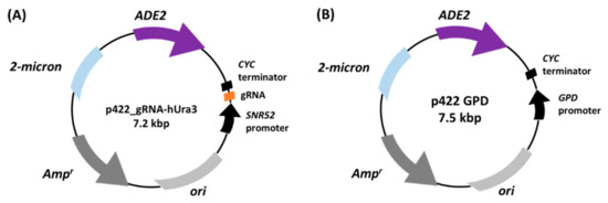 Construction of plasmids for producing gRNA. The gRNA was constitutively produced under the control of SNR52 promoter by introducing multicopy plasmid p422_gRNA-hURA3 (A). For empty vector, p422 GPD (B) was constructed. gRNA, guide RNA.