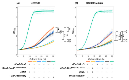 Cell growth in uracil-deficient medium. (A) Derivatives of UCC3505 strain, (B) derivatives of UCC3505 strain with deletion of ADA2. Yeast cells were precultured in SDC + 5 × U liquid medium for 48 h after transformation. The harvested cells were diluted to 0.2 of OD600 in SDC liquid medium. Thereafter, cell growth was monitored by measuring absorbance at 600 nm with the plate reader. Bands represent the SEM of three or four independent experiments and points represent each experimental data. Orange, the strain expressing dCas9-Gcn5 and gRNA; yellow, the strain expressing dCas9-Gcn5KQL126–128AAA and gRNA; blue, the strain expressing dCas9-Gcn5 without gRNA; light blue, the strain expressing dCas9-Gcn5KQL126–128AAA without gRNA; black, the strain harboring empty plasmids; green, the URA3-recovered strain harboring empty plasmids. A two-tailed Student’s test was used to assess the statistical significance, and the Holm method was used to control the family-wise error rates; ** p < 0.01, N.S. not significant (p > 0.05).