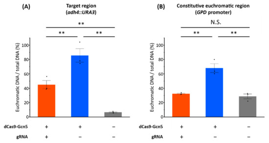 On the other hand, the percentage of euchromatic DNA in the non-target euchromatic region (GPD promoter) did not differ between the strain expressing dCas9-Gcn5 and gRNA and the strain harboring empty plasmids (Figure 5B). However, this region of the strain expressing dCas9-Gcn5 without gRNA was also highly loosened (Figure 5B). These results suggest that chromatin loosening seemed to be nonspecifically induced in a non-target region without gRNA expression.