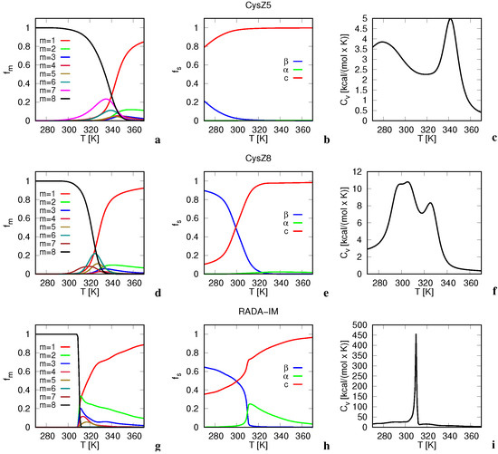 The temperature profiles of the fractions of monomers and associates from dimers to octamers, obtained by MREMD simulations of eight-chain systems are shown, for selected peptides (CysZ5, CysZ8 and RADA-IM), in Figure 2a,d,g. It can be seen from the figure that octamers and monomers dominate before and after the transition temperature, respectively. The dimers constitute a remarkable fraction of the ensemble after the transition temperature, particularly for the RADA-IM—RADA-KGHK peptides.