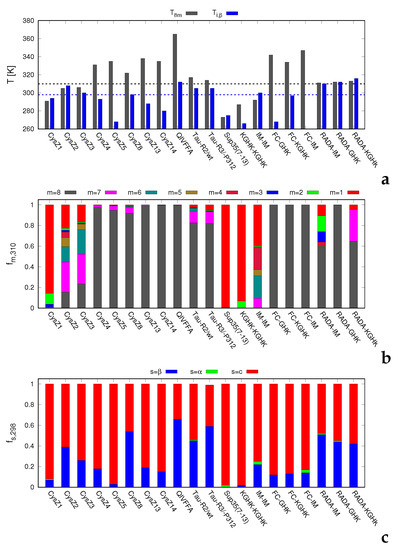 The RADA-IM—RADA-KGHK systems are different from the other ones because the sharp decay of the amount of octamers nearly coincides with that of -structure (Figure 2g,h and Figure 3). This feature is also reflected in the appearance of a single sharp heat-capacity peak (Figure 2i). It can be seen from Figure 3c that the -helical structure is residual at the room temperature. For the RADA-IM—RADA-KGHK peptides, the -structure emerges in quite a significant amount near , as displayed in Figure 2h for RADA-IM.