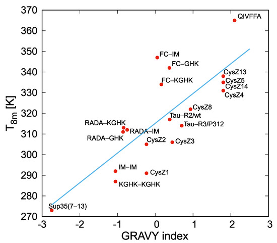 Plot of the correlation between the GRAVY indices and the half−point octamer−melting temperatures of the peptides studied. The correlation equation is . The correlation coefficient and standard deviation in are and K, respectively. The graph was drawn with gnuplot [57].