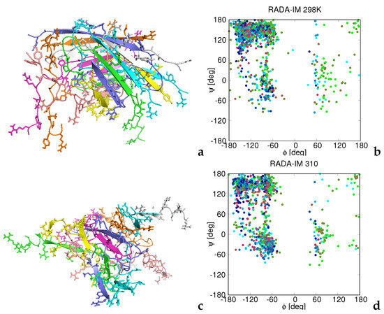 Representative structures of the octamers of RADA-IM at T = 298 K (a) and T = 310 K (b) obtained in MREMD simulations of eight-chain systems and the corresponding plots of the backbone and angles collected from all five models obtained by the cluster analysis at these two temperatures (b,d). Each chain in panels a and c is colored by a different color. Backbones are represented as ribbons and the side chains are shown in the stick representation. The structures were obtained by converting the UNRES chains into the all-atom representation. Each point in the -plots is colored according to residue index (chain index ignored), from blue to red from the N- to the C-terminus. The drawings were produced with PyMol [64] and gnuplot [57], respectively.