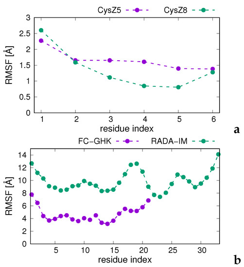 C-atom root mean square fluctuations (RMSF) for CysZ5, CysZ8, FC-GHK and RADA-IM plotted in residue index. The graphs for CysZ5 and CysZ8 are shown in panel (a), while those for FC-GHK and RADA-IM are shown in panel (b). The RMSFs were calculated as the standard deviations of the positions of the C atoms over all five models obtained in MREMD simulations of eight-chain systems and subsequent cluster analysis at T = 298 K and all chains from those of the mean chain structure The graphs were drawn with gnuplot [57].