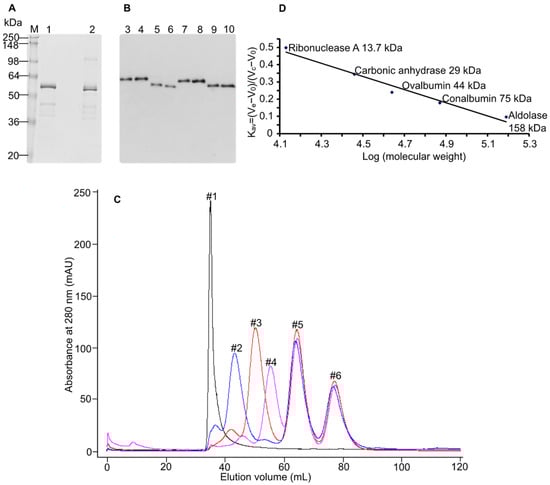 To investigate the influence of the prodomain presence on the structure of the enzyme, WT-MT1-MMP-ED and R111 → A-MT1-MMP-ED were stably transfected into S2 cells and scaled up so that the enzymes were present in sufficient quantity for study. The constructs generated were purified from the insect cell culture supernatant by IMAC and then applied to size-exclusion chromatography. Before running the samples on the sephacryl column, the concentrated enzymes were passed through a 0.22 µm filter to remove any precipitated or aggregated proteins which may have occurred during purification and concentration, thus avoiding the unwanted protein multimerization provided by the aggregated enzymes. Elution of WT-MT1-MMP ectodomain preparations on the sephacryl column yielded three distinct peaks (marked with #1, #2, and #3; Figure 3A). Coomassie brilliant blue-stained SDS gel analysis revealed the presence of WT-MT1-MMP-ED in all fractions. Using the calibration curve of the sephacryl S200 column (Figure 2C,D), it can be estimated that peak #3 has a size of 60 kDa that corresponds to the monomeric form of WT-MT1-MMP-ED. Peak #2 also contains WT-MT1-MMP-ED, and its size is calculated to be 120 kDa. The first peak (#1) contains the highest molecular weight forms of WT-MT1-MMP-ED, but due to the resolution of the gel filtration column, it is not possible to calculate the exact multimeric state of the enzyme beyond the dimeric form. The samples corresponding to each peak were loaded on SDS-PAGE (Figure 3B). Under reducing and non-reducing conditions, the WT-MT1-MMP-ED migrated at the same level, suggesting that the multimeric structures are built up based on non-covalent interactions. On the other hand, the R111 → A-WT-MT1-MMP-ED (the furin mutant version) chromatogram showed only two major peaks (Figure 3C). SDS-PAGE analysis of all fractions from the gel filtration column revealed that this mutant is present in the third peak only (Figure 3D, lane 3). Peak #1(Figure 3D, lane 1) and peak #2 (Figure 3D, lane 2) contained protein contaminants originating from the insect cell culture medium. Determination of the molecular weight of the enzyme from peak #3 provided a size of 70 kDa. The difference of 10 kDa in the molecular weight between this furin mutant and the WT enzyme indicates the presence of the prodomain, and the enzyme adopts a monomeric structure. This molecular mass difference can be observed as a shift of the third peak towards a higher molecular weight (Figure 3, marked with a dotted line).