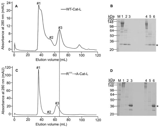 Sephacryl S-200 gel filtration column (GE healthcare, Chicago, IL, USA) was used for all separation experiments with a bed volume of 120 mL connected to the AKTA FPLC purification system. The following running settings were used: flow rate: 0.5 mL/min; sample concentration: 1 mg/mL; total volume injected: 1 mL; fraction size: 1 mL, and 50 mM Tris pH 7.4, 150 mM NaCl, 5 mM CaCl2, 10 µM CT1746 as running buffer. Calibration of the column was performed by using Gel Filtration LMW and HMW Calibration Kit (GE Healthcare, IL, USA) with 50 mM Tris pH 7.4, and 150 mM NaCl as running buffer according to the manufacturer’s instructions. Briefly, four runs were performed as follows: blue dextran was used alone to determine the void volume of the column; in the second run a mixture of aldolase, carbonic anhydrase, and ribonuclease A was used; the third run had the composition of conalbumin, carbonic anhydrase, and ribonuclease A; in the mixture for the fourth run ovalbumin, carbonic anhydrase, and ribonuclease A were present. The IMAC-purified proteins were concentrated to approx. 1 mg/mL and passed through a 0.22 µm filter to remove any precipitated or aggregated enzyme before injecting it into the column. The enzymes concentrations were determined by using the Beer–Lambert Law. The absorption of the enzymes was measured at 280 nm, and the concentrations were calculated with their corresponding extinction coefficient []. The extinction coefficients calculated and used for each construct: 97,290 M−1cm−1 for WT-MT1-MMP-ED; 107,260 M−1cm−1 for R111 → A-WT-MT1-MMP-ED; 36,900 M−1cm−1 for WT-Cat-L; 46,870 M−1cm−1 for R111 → A-Cat-L; 61,880 M−1cm−1 for L-Hpx1.