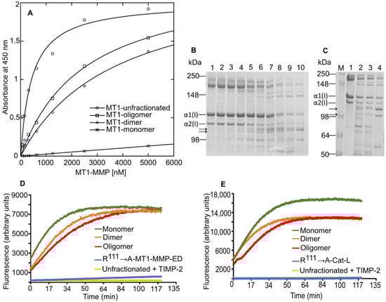 To investigate whether there are any functional consequences of WT-MT1-MMP-ED multimerization, the binding of the oligomeric forms of WT-MT1-MMP-ED to type I collagen was analyzed in ELISA, and the degradation of this substrate was performed. Measurements of the binding in ELISA of the monomeric form of WT-MT1-MMP-ED showed that this structure has a weak affinity towards type I collagen compared to the unfractionated WT-MT1-MMP-ED (all oligomeric forms of WT-MT1-MMP-ED in the same sample), which provided the highest signal in ELISA (Figure 6A). The dimeric and higher oligomeric forms of WT-MT1-MMP-ED showed a binding affinity higher than the monomeric form but not as high as the unfractionated. Next, the enzymatic activity of all oligomeric structures was measured by their ability to degrade type I collagen in solution. Thus, the unfractionated WT-MT1-MMP-ED was able to degrade type I collagen to ¾ specific fragments in a concentration dependence manner and CT1746, a synthetic matrix metalloproteinase inhibitor, could block the degradation activity of the unfractionated WT-MT1-MMP-ED (Figure 6B). Incubation of the separated multimeric structures with type I collagen, followed by migration on SDS-PAGE, revealed that all multimeric forms of WT-MT1-MMP-ED were able to cleave type I collagen substrate with high efficiency (Figure 6C). Furthermore, we have analyzed the ability of the oligomeric forms of WT-MT1-MMP-ED to hydrolyze the fluorogenic peptide substrate QF-24. All multimeric structures of WT-MT1-MMP ectodomain (Figure 6D) and Cat-L construct (Figure 6E) showed cleavage of the fluorogenic peptide. The specificity of the substrate cleavage was investigated by using the TIMP-2 endogenous inhibitor of MT1-MMP. In this regard, the experimental results indicate that the hydrolysis of the substrate was inhibited in all MT1-MMP multimeric structures (Figure 6D,E) in the presence of TIMP-2. Moreover, the CT1746 synthetic inhibitor completely blocked the cleavage activity of the multimeric structures. These data demonstrate the presence and the identity of the MT1-MMP in the eluted fractions.
