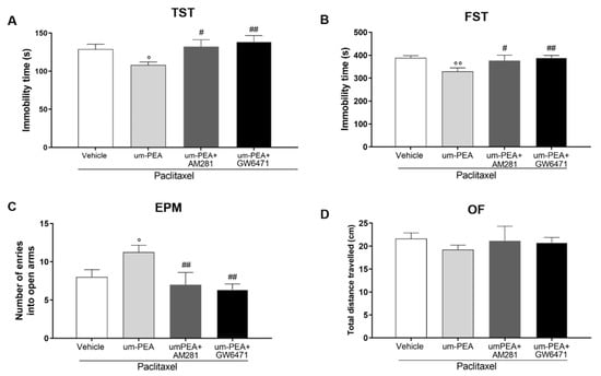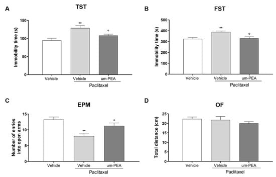 We investigated the possible effect of um-PEA in reducing PTX-induced depressive-like behaviors as assessed in the TST and FST. As expected, both tests showed that PTX increased immobility time compared to vehicle-treated mice (** p < 0.01; Figure 1A,B). Um-PEA administration for 7 days after the last PTX injection significantly reduced the time of immobility compared to vehicle-treated mice (° p < 0.05; Figure 1A,B).