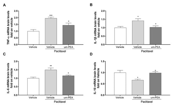 Pro-inflammatory cytokine levels in the hippocampi of vehicle- or um-PEA-treated mice injected with PTX. (A) Fold expression of mRNA for pro-inflammatory TNF-α; (B) fold expression of mRNA for pro-inflammatory IL-1β; (C) fold expression of mRNA for pro-inflammatory IL-6; (D) fold expression of mRNA for anti-inflammatory IL-10; * p < 0.05, ** p < 0.01, *** p < 0.001 versus vehicle group; ° p < 0.05 versus PTX group. Data are presented as mean ± SEM (n = 8). Differences were evaluated by ANOVA followed by Bonferroni’s post hoc test for multiple comparisons.