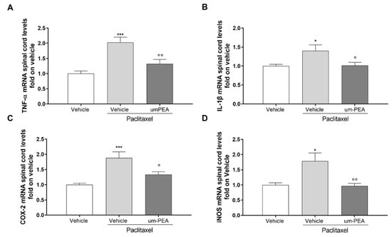 Pro-inflammatory cytokine levels in the spinal cords of vehicle- or um-PEA-treated mice injected with PTX. (A) Fold expression of mRNA for pro-inflammatory TNF-α; (B) fold expression of mRNA for pro-inflammatory IL-1β; (C) fold expression of mRNA for pro-inflammatory COX-2; (D) fold expression of mRNA for anti-inflammatory iNOS; * p < 0.05 and *** p < 0.001 versus vehicle group; ° p < 0.05 and °° p < 0.01 versus PTX group. Results are shown as mean ± SEM. Differences were analyzed using ANOVA followed by Bonferroni’s post hoc test for multiple comparisons.