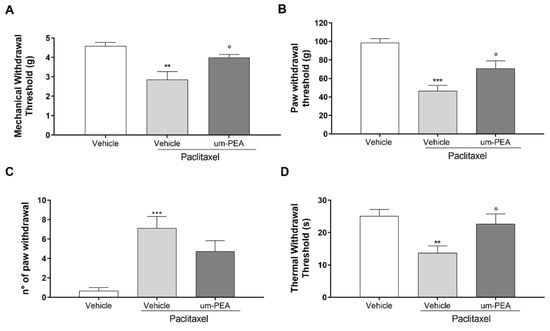 PTX treatment induced neuropathic pain; indeed, PTX-treated mice showed a significant reduction in mechanical allodynia (** p < 0.01) and hyperalgesia (*** p < 0.001) compared to the vehicle group (Figure 5A–B). Um-PEA treatment significantly counteracted the effect of PTX in both tests (° p < 0.05; Figure 5A-B). PTX treatment also induced marked cold allodynia and thermal hyperalgesia, resulting in a significant increase in cold responses (*** p < 0.001) and significant decrease in thermal nociceptive thresholds (** p < 0.01) compared to vehicle group (Figure 5C,D). In contrast, um-PEA administration produced a significant reduction in the number of paw withdrawals in the acetone test, and enhanced the thermal withdrawal thresholds in the Hargreaves test (° p < 0.05) compared to PTX animals (Figure 5C,D).