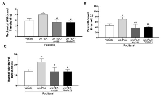 Effect of um-PEA on peripheral neuropathy in presence of CB1 or PPAR-α antagonists. Results of the (A) von Frey test to evaluate mechanical allodynia; (B) Randall–Selitto test to assess mechanical hyperalgesia; (C) Hargreaves test to evaluate thermal hyperalgesia; # p < 0.05 and ## p < 0.01 versus PTX+um-PEA; ° p < 0.05 versus PTX-vehicle group. Data are presented as mean ± SEM (n = 8). Differences were evaluated by ANOVA followed by Bonferroni’s post hoc test for multiple comparisons.