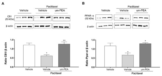 Western blotting analyses for CB1 (A) and PPAR-α (B) receptors in spinal cords. Immunoblots representative of all tissues analyzed are shown. Densitometric analysis of protein bands are reported: the levels are expressed as the density ratio of target to control protein bands (β-actin). * p < 0.05 versus vehicle group; ° p < 0.05 and °° p < 0.005 versus PTX group. Values are expressed as mean ± SEM (n = 3). Differences were evaluated by ANOVA followed by Bonferroni’s post hoc test for multiple comparisons.