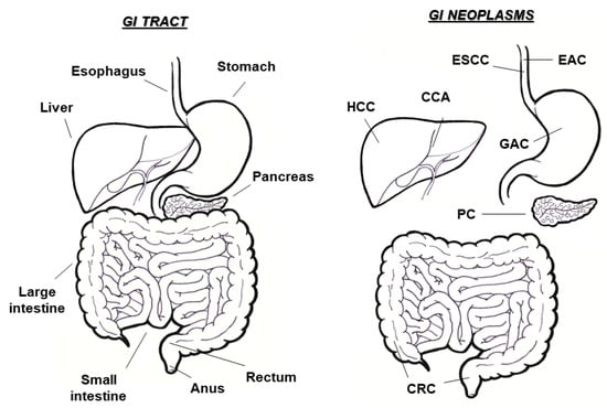 Gastrointestinal (GI) tumors may occur in all anatomic sites within the digestive tract, including esophagus, stomach, liver, pancreas, small intestine, colon, and rectum (Figure 1). They comprise the most frequent malignancies worldwide and contribute around half of the total tumor-related deaths []. In particular, the number of detected GI neoplasms constitute more than 20% of the total cancer diagnoses (4 million, of the 14 million subjects annually diagnosed with cancer, are affected with GI tumors), with the incidence of GI tumors being even higher than that combined between breast and lung cancer [,].