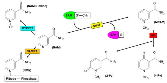 In addition to adipose tissue [], liver represents the organ where the highest NNMT expression is detected. In this site, the enzyme is grouped among those participating in reactions featuring phase II metabolism and is described to be involved in the xenobiotic biotransformation and detoxification [,,]. In hepatocytes, NNMT contributes to NAM homeostasis, together with other NAM-consuming enzymes, namely nicotinamide phosphoribosyltransferase (NAMPT) and Cytochrome P450 2E1 (CYP2E1); the latter is able to switch the catabolic fate of vitamin B3 towards N-oxidation rather than N-methylation, converting NAM into nicotinamide N-oxide (NAM N-oxide) [,] (Figure 2).