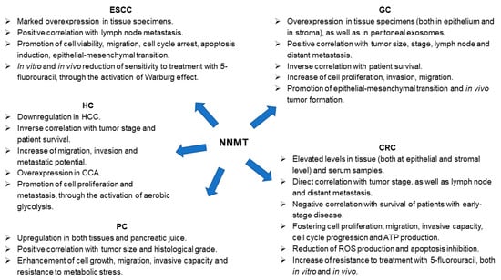 Nicotinamide N-methyltransferase (NNMT) role in gastrointestinal (GI) tumors. Panel illustrating differential expression (tumor versus control tissue) and enzyme involvement in cell phenotype and molecular processes featuring neoplasms affecting GI tract (ESCC, esophageal squamous cell carcinoma; GC, gastric cancer; CRC, colorectal cancer; HC, hepatic cancer; HCC, hepatocellular carcinoma; CCA, cholangiocarcinoma; PC, pancreatic cancer).