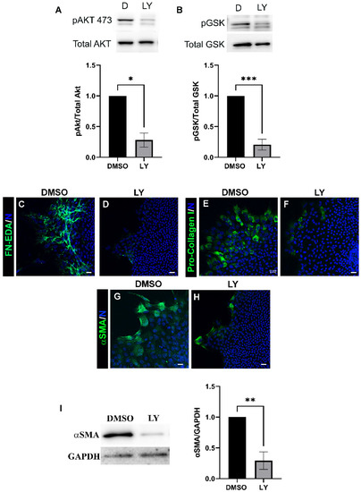 PI3K is a major downstream effector of multiple receptor inputs linked to driving fibrosis, such as TGFβ and integrins [37,38,39,40,41]. We examined the role of PI3Ks in a clinically relevant ex vivo post-cataract surgery chick explant wound healing/fibrosis model in which the resident immune cells activated to populate the wound edge and direct migration of the wounded lens epithelium across the culture substrate acquire a myofibroblast phenotype [30,35]. For these studies, the ex vivo wounded post-cataract surgery cultures were exposed to the pan PI3K inhibitor LY294002, which blocks all class I PI3K isoforms, or to its vehicle DMSO, from D1 through D3 post-injury at which time the CD44+ mesenchymal immune cell leader population first transitions to alpha smooth muscle actin (αSMA)+ myofibroblasts [35]. Their acquisition of a myofibroblast phenotype is preceded by their production of a Fibronectin-EDA (FN-EDA) provisional matrix on the substrate surface, and coincident with the production of a Collagen I (Col-I) matrix [3,35,42]. To determine the efficacy of LY294002 on inhibition of PI3K signaling in the ex vivo mock cataract surgery cultures we examined the activation state (phosphorylation) of its effector Akt (p-ser 473) and the phosphorylation of the Akt target Glycogen Synthase Kinase-3 at ser9 (GSK3) [43,44]. Treatment with LY294002 effectively suppressed activation of Akt and phosphorylation of GSK (Figure 1A,B). To determine the effect of blocking PI3K signaling with LY294002 on the development of fibrosis we performed confocal microscopy imaging following immunolabeling for FN-EDA (Figure 1C,D), pro-Col I (Figure 1E,F) or αSMA+ (Figure 1G,H). The results showed that exposure to LY294002 prevented the production of FN-EDA and Col I in the extracellular microenvironment of the leader cells and the emergence of αSMA+ myofibroblasts. Western blot analysis for αSMA+ also showed significant suppression of expression of this myofibroblast protein (Figure 1I). These studies show that PI3K signaling is required for the formation of a FN-EDA and collagen I rich matrix and induction of the myofibroblast phenotype in response to cataract surgery wounding that is necessary for the development of fibrosis.