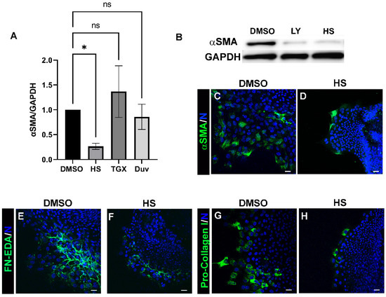 The fibrotic response of mesenchymal leader cells is signaled through PI3K 110α post-cataract surgery wounding. (A) Ex vivo post-cataract surgery explants were treated with vehicle or PI3K isoform specific inhibitors: HS-173 (HS), a PI3K p110α specific inhibitor; TGX-221 (TGX), a PI3K p110β-specific inhibitor; or Duvelisib (Duv) a PI3Kδ/γ selective inhibitor through day 3. Lysates were subjected to immunoblot analysis to determine the effect on αSMA expression. Quantification of the relative intensity of αSMA and GAPDH normalized to DMSO is displayed in the bar graph (n > 3). (B) Representative immunoblot showing the effect of treatment with the pan PI3K inhibitor LY294002 and the PI3K 110α specific inhibitor HS-173 vs. vehicle control on αSMA and GAPDH (loading control) protein expression D3 post-treatment. Both LY294002 and HS-173 show a similar effect on reducing αSMA expression levels without effecting GAPDH. These findings provide further evidence that myofibroblast differentiation is signaled largely through the PI3Kα isoform. (C–H) D3 HS-173 and vehicle treated ex vivo post-cataract surgery explant cultures were immunolabeled for (C,D) αSMA, (E,F) FN-EDA, and (G,H) pro-Col I, co-labeled for DAPI and imaged by confocal microscopy. HS treatment effectively suppressed αSMA+ myofibroblast emergence and the accumulation of FN-EDA and pro-Col I. All images are presented as a single optical plane from collected confocal z-stacks. Error bars represent S.E.M., * p ≤ 0.05, ns: not significant. Magnification bar = 20 µm.