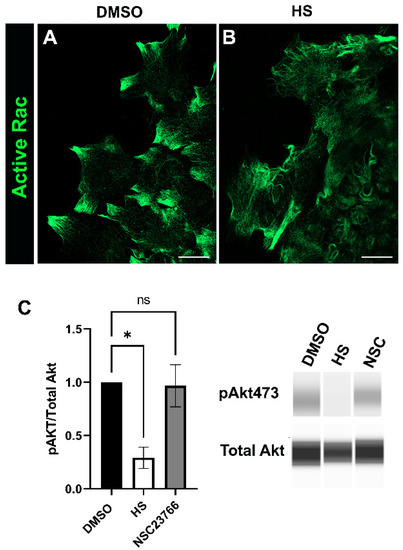 Our findings above revealed roles for both p110α and Rac signaling in promoting the transition of mesenchymal leader cells to αSMA+ myofibroblasts (Figure 2 and Figure 4). To determine the impact of inhibiting p110α on active Rac expressed by leader cells in the ex vivo cataract surgery cultures they were treated for 24 h with either vehicle or the p110α inhibitor HS-173 starting on day 1 post-injury. The cultures were immunolabeled for active Rac and imaged at the leading edge by confocal microscopy. Active Rac was present along filaments in the leader cells of both vehicle and HS treated cultures (Figure 5A,B), but with distinct patterns of organization. In vehicle controls, active Rac was most highly expressed in protrusions extended by the cells along the substrate (Figure 5A), as is also shown in the study in Figure 4. These active Rac-rich protrusive structures were absent in the leader cells of cataract surgery wounded explants cultured in the presence of the p110α inhibitor (Figure 5B). These findings suggest that p110α could impact Rac signaling by altering its localization within leader cells.