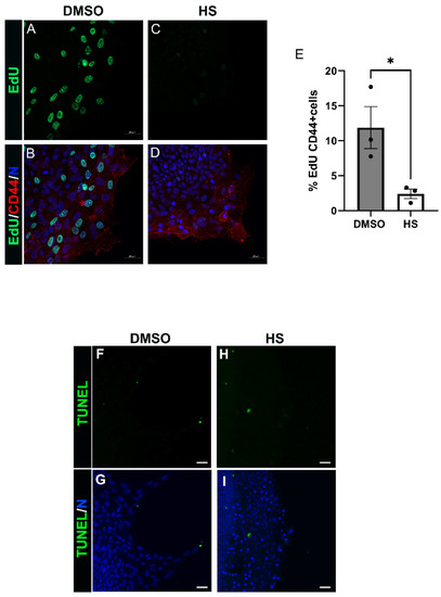 PI3K signaling is a critical regulator of both cell proliferation and survival [23,52], both cellular processes closely linked to the pathological development of fibrosis in tissues [22,53]. To begin to elucidate how the PI3K p110α subunit promotes the fibrotic phenotype in response to lens wounding we investigated whether p110α regulates mesenchymal leader cell proliferation or survival. For these studies, ex vivo post-cataract surgery explants were treated for 24 h with vehicle or the p110α inhibitor HS-173 beginning at culture day 1. The impact of blocking p110α signaling on leader cell proliferation was determined by EdU incorporation (Figure 6A–E). The impact on cell survival was determined by TUNEL analysis (Figure 6F–I). EdU-labeled explant cultures were co-immunolabeled for CD44, a receptor expressed by the resident immune leader cell population post-wounding, and the cultures imaged by confocal microscopy (Figure 6A–D). The percent of CD44-labeled cells that were EdU positive was determined (Figure 6E), and the results showed that p110α signaling is critical to regulating CD44+ leader cell proliferation. In contrast, inhibition of p110α signaling had no effect on leader cell survival (Figure 6F–I). These findings reveal that PI3K p110α signaling plays a critical role in inducing proliferation of myofibroblast progenitor cells, a process essential to the establishment and expansion of myofibroblasts and the progression of fibrotic disease.