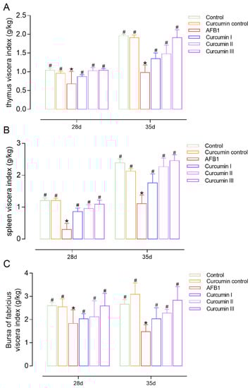 At day 28, there were significant reductions in the viscera index of the thymus, spleen and bursa of Fabricius in the AFB1 group compared to the control (Figure 1). Additionally, it is noted that the AFB1-induced viscera index reduction could not be self-recovered at day 35. In the curcumin groups II and III, the viscera indexes were obviously ameliorated, and the ameliorative effect of curcumin was continuous up to 7 days after the withdrawal of curcumin from the diet. In addition, the ameliorative effect of curcumin on promoting the growth and development of the immune organs via an increasing viscera index in broilers was in a dose-dependent manner.