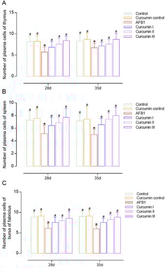 Change in plasma cell numbers in the immune organs of broiler chickens at 28 days and 35 days (n = 8). (A) Thymus plasma cell number, (B) spleen plasma cell number, (C) bursa of Fabricius plasma cell number. Each bar represents means ± standard deviation (SD). * p < 0.05 shows the statistically significant differences from control group. # p < 0.05 shows the statistically significant differences from AFB1 group.