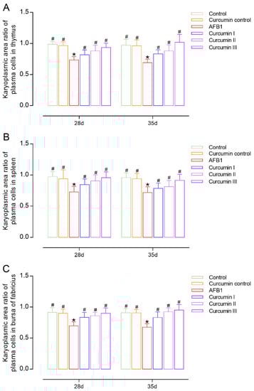 The karyoplasmic area ratio of plasma cells can indirectly reflect the proliferation capacity of plasma cells, which is widely used in the classification and differential diagnosis of tumors. The karyoplasmic area ratio of normal plasma cells is maintained within a certain range; when plasma cells are damaged, the value of the ratio shows abnormal changes. Compared to the control group, the present results (Figure 3) show that the karyoplasmic area ratios of the plasma cells in the thymus, spleen and bursa of broilers treated with AFB1 were significantly decreased (p < 0.05) at day 28. The karyoplasmic area ratio of the plasma cells in immunological organs cannot be recovered by removing AFB1 from the diet. Low dose curcumin (150 mg/kg) was not sufficient to alleviate the AFB1-induced reduction in the karyoplasmic area ratio in the thymus (p > 0.05, Figure 3A). In immune organs, both a medium and high dose of curcumin successfully caused a significant recovery of the karyoplasmic area ratio in a dose-dependent manner (p < 0.05). Meanwhile, the same trend of curcumin ameliorating the plasma cell karyoplasmic area ratio was found at day 35 after the withdrawal of AFB1 and curcumin from the diet.