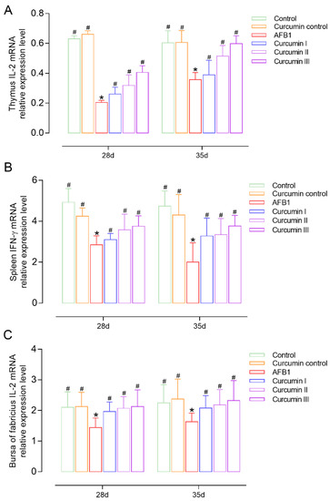Cytokines, such as IL-2 and IFN-, are polypeptide factors secreted and released by T lymphocytes (CD4+ or CD8+), which can regulate cell activity and play a critical role in cellular immunity [51,52,53]. IL-2 not only promotes B lymphocyte proliferation and differentiation, as well as antibody secretion, but it also enhances antiviral activity by suppressing CD8 + T cells’ apoptosis [54]. IFN-γ, a soluble glycoprotein with high efficiency and activity, is a cytokine with antitumor, antivirus and strong immunomodulatory capabilities that can directly induce T and B lymphocytes’ development [55,56]. We observed that AFB1 exposure considerably downregulated the expressions of IL-2 and IFN-γ mRNA. This is in accordance with previous reports [57,58] in that the expression levels of the IL-2 and IFN-γ genes are associated with AFB1-induced immune disorder, probably due to AFB1 poisoning causing DNA transcription and mRNA translation in lymphocytes and ultimately affecting protein biosynthesis [59]. In our study, curcumin recovered the mRNA expressions of IL-2 and IFN-γ in a dose-dependent manner, and a diet of 450 mg/kg of curcumin had the best remission effect against AFB1. These results indicated that curcumin could activate the cytokine genes’ expression in immune organs against AFB1-induced immune system injury. Furthermore, we discovered that the immunotoxicity of AFB1 and the protective effects of curcumin lasted until day 35, implying that AFB1 and curcumin have aftereffects and beneficial effects on broiler growth and immune function.