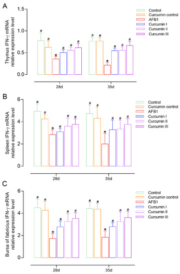 Changes in the expression of IFN-γ in the immune organs of broiler chickens at 28 days and 35 days (n = 8). (A) The IFN-γ mRNA expression in thymus, (B) the IFN-γ mRNA expression in spleen, (C) the IFN-γ mRNA expression in bursa of Fabricius. Each bar represents means ± standard deviation (SD). * p < 0.05 shows the statistically significant differences from control group. # p < 0.05 shows the statistically significant differences from AFB1 group.