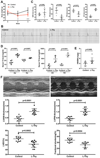 First, mice were treated with L-thyroxine (L-Thy) by intraperitoneal injection daily for 4 weeks (Material and Methods) [13,14]. From the second week, L-Thy-induced mice were lighter than controls (23.55 ± 0.29 vs. 25.04 ± 0.48 g, p = 0.0076), and the difference in weight of both groups increased at the 4th week (24.25 ± 0.28 vs. 27.29 ± 0.54 g, p < 0.0001, Figure 1A). Second, after 4 weeks of induction with L-Thy, the RR and PR interval times were both decreased in the L-Thy-treated mouse group, while the QT interval time was increased in the L-Thy-treated mouse group (Figure 1B,C). The serum levels of TT3 and TT4 indicated that the levels of TT3 and TT4 in the L-Thy group were significantly higher than those in the control group at the 2nd and 4th weeks (Figure 1D). Meanwhile, the heart weight was significantly higher in the L-Thy group than in the control group (Figure 1E). Additionally, L-Thy-treated mice showed a significant increase in the left ventricular hypertrophy parameters, and LVAW and LVPW coincided with a significant reduction in the LV cardiac function markers, EF, and FS as compared to controls (Figure 1F).