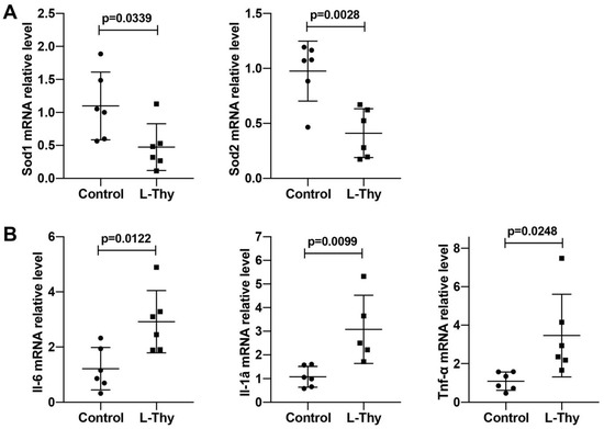 It was reported that L-Thy increases the oxidative stress response, leading to a weakened antioxidative capacity of the myocardial cells and accelerated cell damage [3]. In this study, quantitative real time-polymerase chain reaction (qRT-PCR) and Western blot (WB) showed that Sod1 and Sod2 mRNA expression was lower in the L-Thy group, suggesting that ROS expression was higher in the L-Thy group (Figure 3A and Figure S1). In addition, it has been reported that an inflammatory response occurs in hyperthyroidism-induced cardiomyopathy. In our study, we detected the expression levels of Tnf-α, Il-1β, and Il-6 in myocardial tissues, which are key indicators of the proinflammatory response. The results showed that compared with those in the control group, the mRNA expression levels of Tnf-α, Il-1β, and Il-6 in the hyperthyroidism group were significantly increased compared with those in the controls (Figure 3B and Figure S1). This suggested that L-Thy would induce the cardiac inflammatory response and oxygen free radical production.