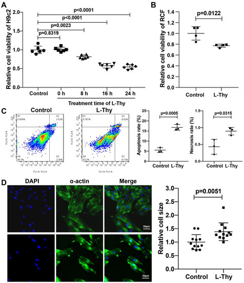 To further elucidate the mechanism, we built a cell model. The H9c2 cell line was also treated with 2 μM L-Thy [13], and we found that L-Thy decreased the viability of H9c2 cells, as detected by the CCK-8 assay (Figure 4A). To explain why fibrosis increases in L-Thy-induced cardiomyopathy (Figure 2C), we also treated the rat cardiac fibroblasts (RCF) with L-Thy. The results showed that L-Thy also decreased the cell viability of fibroblasts, indicating that fibrosis was not caused by the proliferation of fibroblasts treated with L-Thy in L-Thy-induced cardiomyopathy (Figure 4B). To verify the apoptosis and necrosis of H9c2 cells, flow cytometry was used to detect that the necrosis and apoptosis percentages of the H9c2 cell line were higher in the L-Thy group than in the control group (Figure 4C). In addition, the immunofluorescence of α-actin results suggested that the cell size of L-Thy-treated H9c2 cells was larger than that of control cells (Figure 4D).
