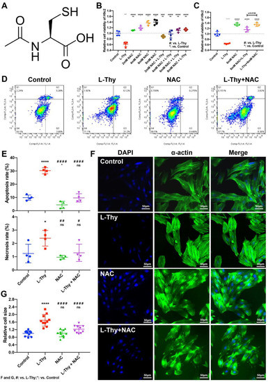 Figure 6. NAC attenuated the phenotype of the hyperthyroidism-induced cardiomyopathy cell model. The H9c2 cells in the logarithmic growth phase were plated. The control group was cultured in normal medium, and the L-Thy group was treated with 2 μM L-Thy for 24 h. (A) The structural formula of NAC. (B) Alterations in the viability of H9c2 cardiac cells treated with NAC at different concentrations, as determined by Cell Counting Kit-8 assay. The 2/4/6/8 mM NAC group was cultured in normal medium and then treated with different concentrations of NAC for 6 h. In the L-Thy + 2/4/6/8 mM NAC group, H9c2 cells were previously incubated with 2 μM L-Thy for 24 h and then maintained in medium containing different concentrations of NAC for 6 h. (C) Alterations in the viability of H9c2 cells treated with NAC before or after cell modelling. The 6 mM NAC group was treated with 6 mM NAC for 6 h. In the L-Thy + 6 mM NAC group, H9c2 cells were previously incubated with 2 μM L-Thy for 24 h and then maintained in 6 mM NAC-containing medium for 6 h. In the 6 mM NAC + L-Thy group, H9c2 cells were previously incubated with 6 mM NAC-containing medium for 6 h and then maintained in 2 μM L-Thy-containing medium for 24 h. (DG) The control group was cultured in normal medium, and the L-Thy group was treated with 2 μM L-Thy for 24 h. In addition, the NAC group was treated with 6 mM NAC for 6 h. In the L-Thy + NAC group, H9c2 cells were previously incubated with 2 μM L-Thy for 24 h and then maintained in 6 mM NAC-containing medium for 6 h. (D,E) Typical apoptotic and necrosis pictures and quantification of the apoptosis rate and necrosis rate in different groups. (F,G) Representative image and surface area quantification of α-actin-stained H9c2 cardiac cells. Scale bar, 50 μm. */# p < 0.05, ## p < 0.01, ### p < 0.001, and ****/#### p < 0.0001.