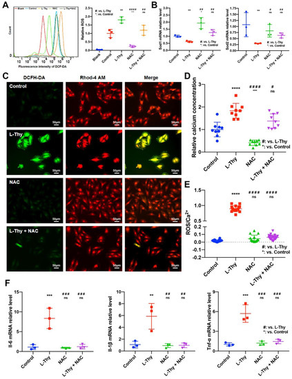Figure 7. NAC attenuated the ROS/Ca2+ pathway in a hyperthyroidism-induced cardiomyopathy cell model. H9c2 cells in logarithmic growth phase were plated. The control group was cultured in normal medium, and the L-Thy group was treated with 2 μM L-Thy for 24 h. In addition, the NAC group was treated with 6 mM NAC for 6 h. In the L-Thy + NAC group, H9c2 cells were previously incubated with 2 μM L-Thy for 24 h and then maintained in 6 mM NAC-containing medium for 6 h. (A) Representative images and quantification of ROS levels in H9c2 cells determined by FCM. (B) The mRNA levels of Sod1and Sod2 measured by qRT-PCR. (CE) Representative images, quantification of DCFH-DA/Rhod-4-stained H9c2 cells and ratio of Ros/Ca2+ in different groups. Scale bar, 50 μm. The intracellular ROS and calcium contents were expressed by the fluorescence intensity of DCFH-DA and Rhod-4, respectively. Fluorescence intensity was quantified by the ImageJ plugin 3D Object Counter [16,17]. (F) The mRNA levels of Il-6, Il-1, and Tnf-α were measured by qRT-PCR. */# p < 0.05, **/## p < 0.01, ***/### p < 0.001, and ****/#### p < 0.0001.