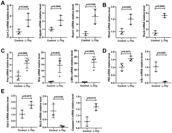 Figure 8. L-Thy-induced phenotypes were explained from the perspective of signalling pathways. (AE) qRT-PCR was used to detect Cav1.3, calpain, Rcan1, RhoA, Rock, Anp, Bnp, β-Mhc, P65, IκBα, Gal-3, Bcl-2, and Caspase-3 mRNA levels.