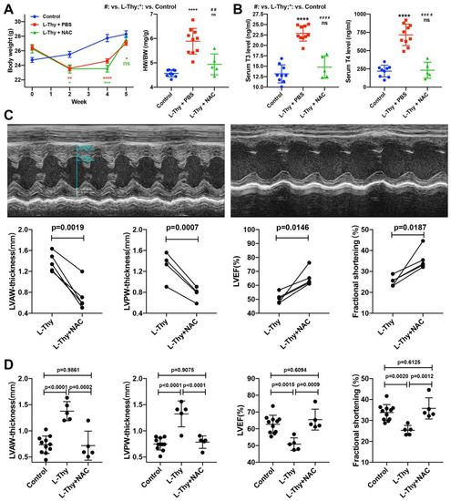 Figure 9. NAC could attenuate the cardiac function of hyperthyroidism-induced cardiomyopathy in vivo. (A) Average weight and quantification of the heart weight to body weight (HW/BW) in all experimental groups of mice. (B) Quantification of the T3 and T4 contents in the serum of all experimental groups of mice. (C,D) Representative images of M-mode echocardiography and quantifications of LVAWd, LVPWd, LVEF, and LVFS. */# p < 0.05, **/## p < 0.01, ***/### p < 0.001, and ****/#### p < 0.0001.
