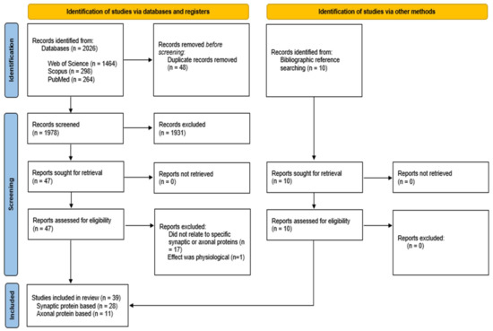 The abstracts of the results were exported into Abstrackr, an online abstract screening application (Wallace et al., 2012). The imported results were initially screened by title and abstract according to ‘labels’ or key words which included ‘alpha synuclein’, ‘protein’, ‘synaptic’, and ‘axonal’, enabling a more efficient screening process. Duplicate studies were removed. All of the studies that met the inclusion criteria were assessed further with the steps of the selection process that were highlighted in the Preferred Reporting Items for Systematic Reviews and Meta-Analyses (PRISMA) flow diagram (Figure 1) [65]. A total of 2026 abstracts were identified from the databases with 1464 that were obtained from the Web of Science, 298 from Scopus, and 264 from PubMed. There were ten additional abstracts that were identified via bibliographic reference searching. Removing duplicates excluded 48 abstracts and initial screening using the inclusion criteria excluded 1978 abstracts. Of the remaining 57 abstracts, 39 fulfilled the inclusion criteria and provided data regarding α-synuclein toxicity and synaptic and axonal proteins. Of those excluded, 17 did not refer to specific synaptic or axonal proteins and one referred to a physiological α-synuclein effect (Figure 1).