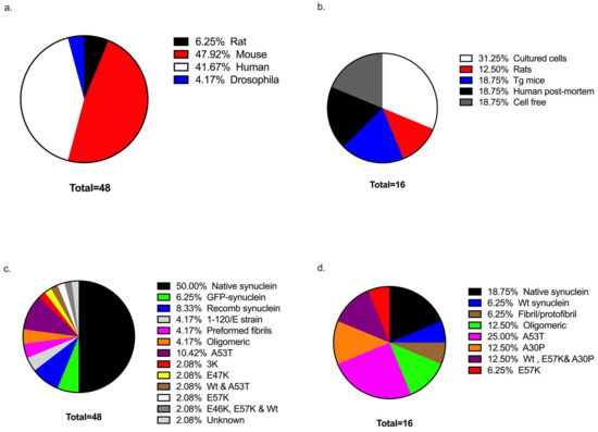Shown in this figure is a breakdown of the studies that were analyzed in this systematic review to study synaptic proteins (a,c) and axonal proteins (b,d). For each protein category (synaptic or axonal), the source of sample for studies (a,b) and the type of α synuclein that was used in the study (c,d) are shown.