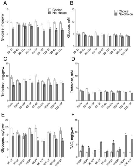 Effects of dietary choice on the levels of metabolites. Body glucose (A), hemolymph glucose (B), body trehalose (C), hemolymph trehalose (D), glycogen (E) and triglycerides (F) under choice and no-choice nutrition. S—sucrose percent in the medium; Y—yeast percent in the medium. Data are presented as mean ± S.E.M. for 4–5 independent replicates, values were considered significantly different if p < 0.05 and marked with *. The icons in the subfigures (A) also apply to (C–F).