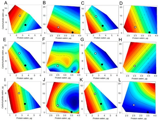 Response surfaces showing dependency of metabolite levels on macronutrients eaten. (A) body glucose on choice nutrition; (B) body glucose on no-choice nutrition; (C) hemolymph glucose on choice nutrition; (D) hemolymph glucose on no-choice nutrition; (E) body trehalose on choice nutrition; (F) body trehalose on no-choice nutrition; (G) hemolymph trehalose on choice nutrition; (H) hemolymph trehalose on no-choice nutrition; (I) glycogen on choice nutrition; (J) glycogen on no-choice nutrition; (K) triglycerides on choice nutrition; (L) triglycerides on no-choice nutrition. Open dots represent the values at P:C of 2.5:8 and filled dots for 3.5:5 P:C ratio. Red color on the response surfaces represents the highest values while dark blue shows the lowest ones, other colors represent intermediate values.