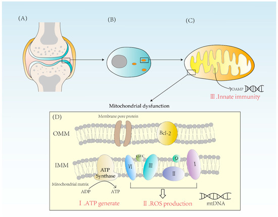 (A) A diagram of the articular cartilage structure. Cartilage is mainly composed of chondrocytes. (B) The distribution of mitochondria in chondrocytes is related to the energy requirement. (C) Mitochondrion is a double-membrane organelle. Mitochondria have two membranes, an outer membrane and an inner membrane. Mitochondrial inner membrane folds to form cristae. The mitochondrial matrix contains mtDNA. DAMPs activate innate immunity, causing inflammatory reactions. (D) Mitochondria synthesize ATP through ATPase and form ROS through complexes I, II, III, and IV. When mitochondria are dysfunctional, both excessive ROS and energy imbalance will contribute to the occurrence of RA. OMM = outer mitochondrial membrane, IMM = inner mitochondrial membrane, Bcl-2 = B-cell leukemia/lymphoma-2, DAMPs = damage-associated molecular patterns.