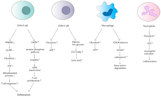 Neutrophils are the source of stimulation and damage to extracellular mitochondrial DNA in autoimmune diseases. Mitochondrial dysregulation in neutrophils has an important impact on the course of RA [34]. Neutrophils are the origin of autoantigens which can promote inflammation and lead to tissue damage. The degree of neutrophil activity is heavily dependent on how much energy is produced by glycolysis. Researchers have found that neutrophils from RA synovial fluid exhibit enhanced glycolytic gene expression compared to peripheral blood neutrophils from other parts of the body (Figure 2). Mitochondria produce large amounts of ATP when they are dysfunctional, thus neutrophil activity is enhanced, leading to a series of inflammatory responses. Although a relevant role in RA has not been demonstrated, mitochondrial dysfunction has been shown to affect neutrophils, such as chemotaxis [34]. Because of the relatively few relevant studies, mitochondrial metabolism of neutrophils in RA deserves further investigation.