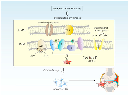 Etiology of mitochondrial dysfunction in RA. Hypoxia causes multiple changes in mitochondrial structure, genome, and dynamics, resulting in decreased ATP synthesis, excessive ROS production, and increased accumulation of mtDNA mutations. The more TNF-α and IFN-γ in synovium, the higher the frequency of mtDNA mutation. Mitochondrial dysfunction leads to cellular damage, including lots of inflammation reactions, which causes RA. FLS = fibroblast-like synoviocytes, OMM = outer mitochondrial membrane, IMM = inner mitochondrial membrane. Smac = second mitochondrial-derived activator of caspases, AIF = apoptosis-inducing factor, Cyt. c = cytochrome c.