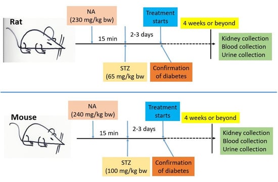 - Sathaye, S.; Kaikini, A.A.; Dhodi, D.; Muke, S.; Peshattiwar, V.; Bagle, S.; Korde, A.; Sarnaik, J.; Kadwad, V.; Sachdev, S. Standardization of type 1 and type 2 diabetic nephropathy models in rats: Assessment and characterization of metabolic features and renal injury. J. Pharm. Bioallied Sci. 2020, 12, 295–307. [Google Scholar]