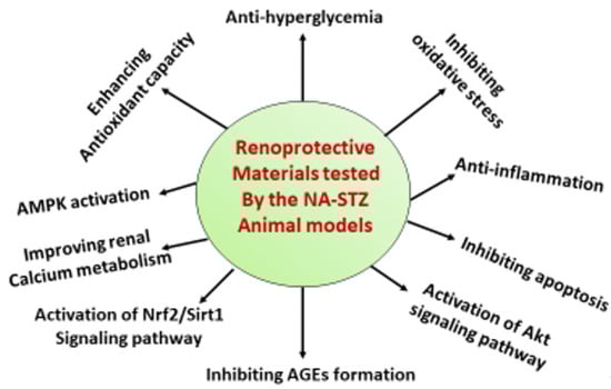 | Renoprotective Materials | Rodent Model (NA/STZ, mg/kg) | Mechanism | Reference |