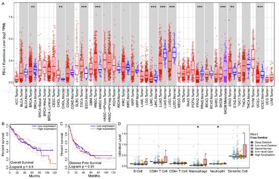 To initially explore the role of PD-L1 in cancer, we used TIMER [42] to obtain an understanding of the expression levels of PD-L1 in each cancer type. We recognized that PD-L1 mRNA expression levels were significantly abnormal in many cancer types, in particular, its expression was significantly downregulated in HCC compared to normal tissue (p value < 0.001) (Figure 1A). We further explored the impact of PD-L1 expression on prognosis using GEPIA [43]. Although we did not observe a significant association of PD-L1 with overall survival or disease-free survival in the TCGA LIHC cohort (Figure 1B,C), a series of studies indicated that PD-L1 expression affects the prognosis of HCC. Next, we preliminarily investigated the impact of PD-L1 on the immune systems. We found that the immune cell infiltration levels changed with PD-L1 gene copy number, especially in macrophages and neutrophils, which significantly correlated with copy number variant type (Figure 1D).